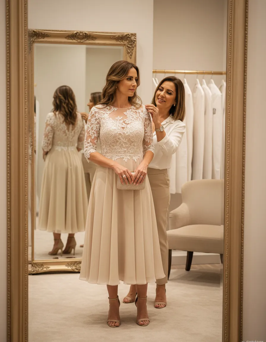 Vestido midi en tono nude + blazer ligero en marfil + sandalias doradas delicadas + clutch champagne.